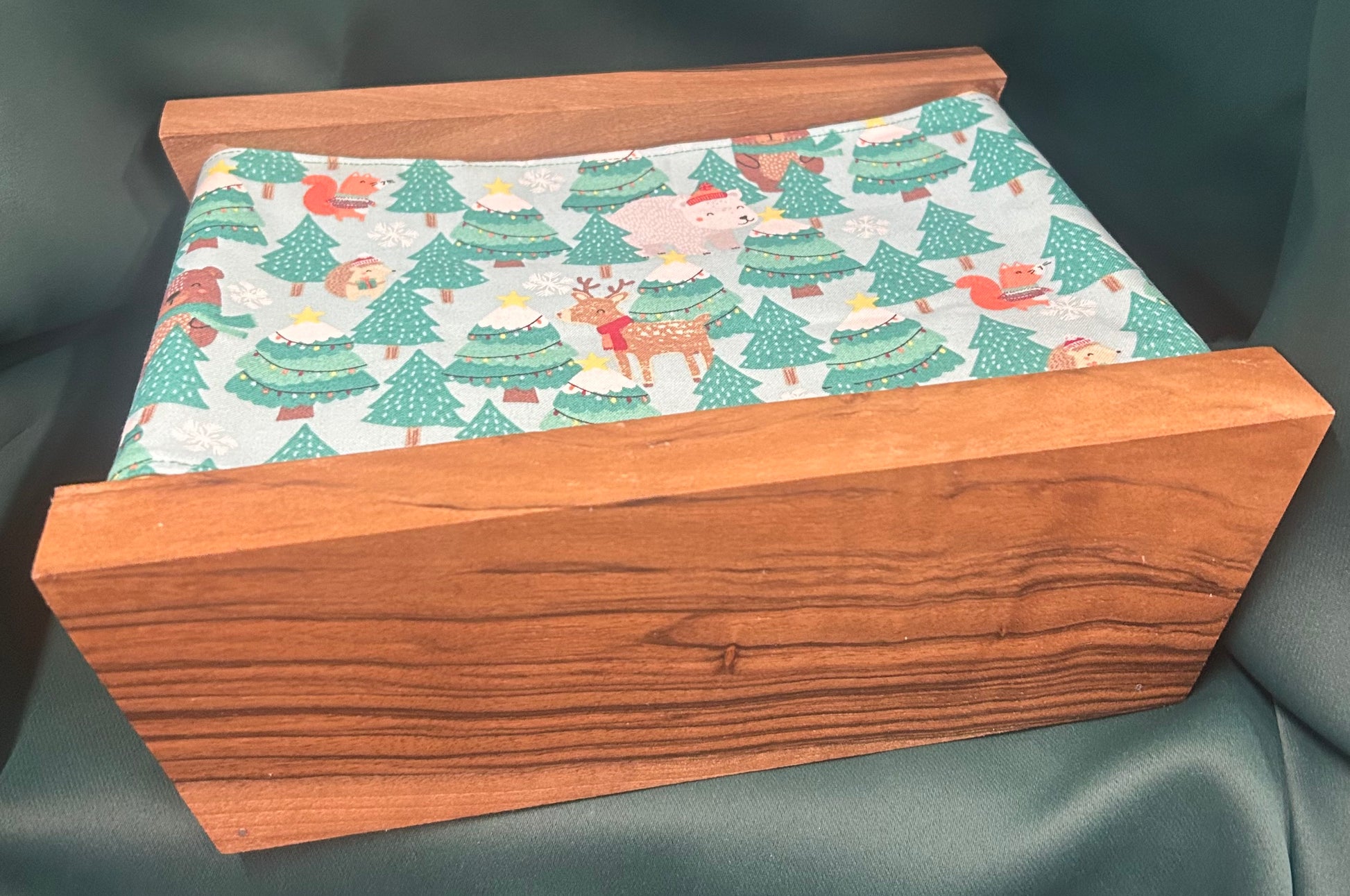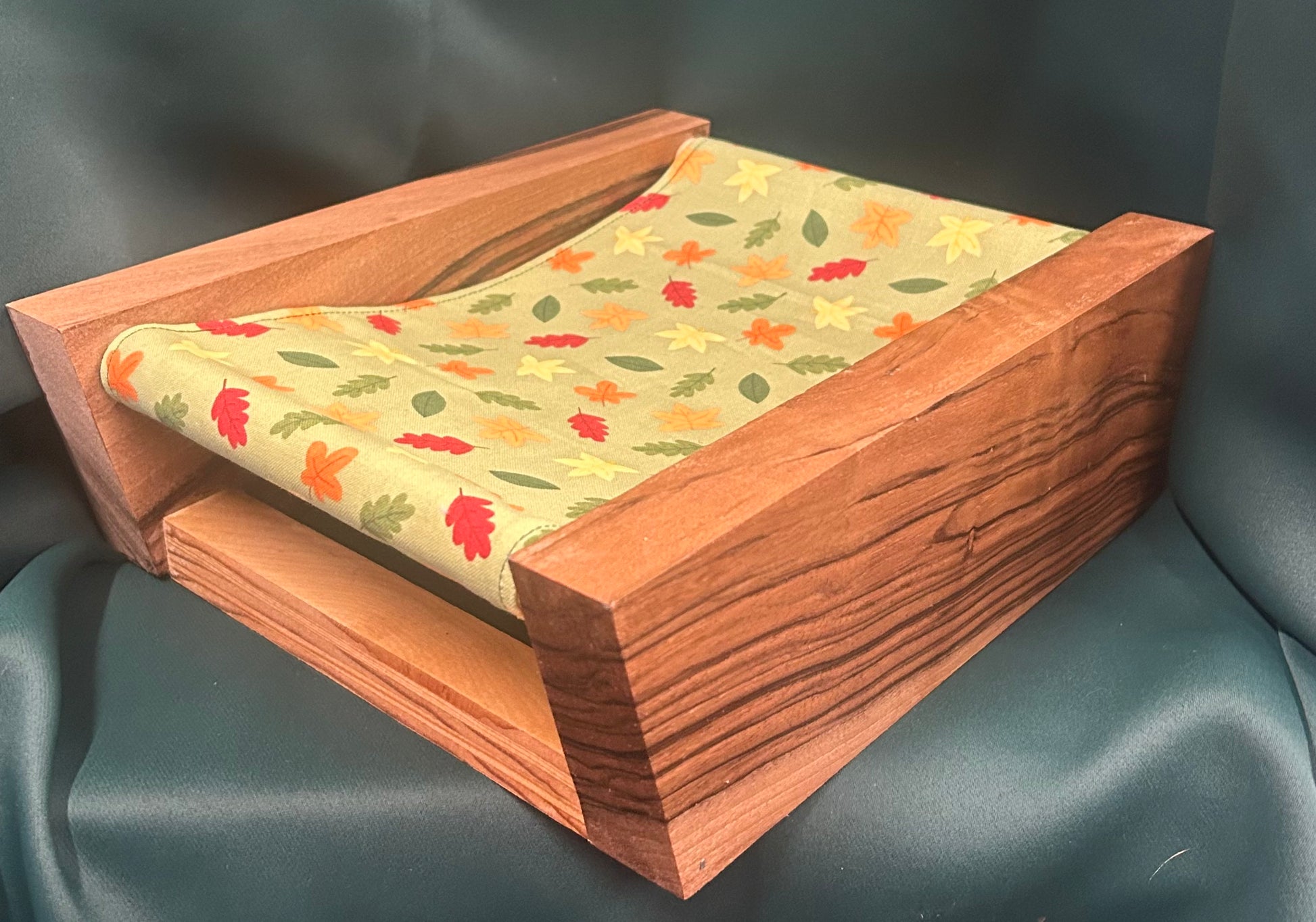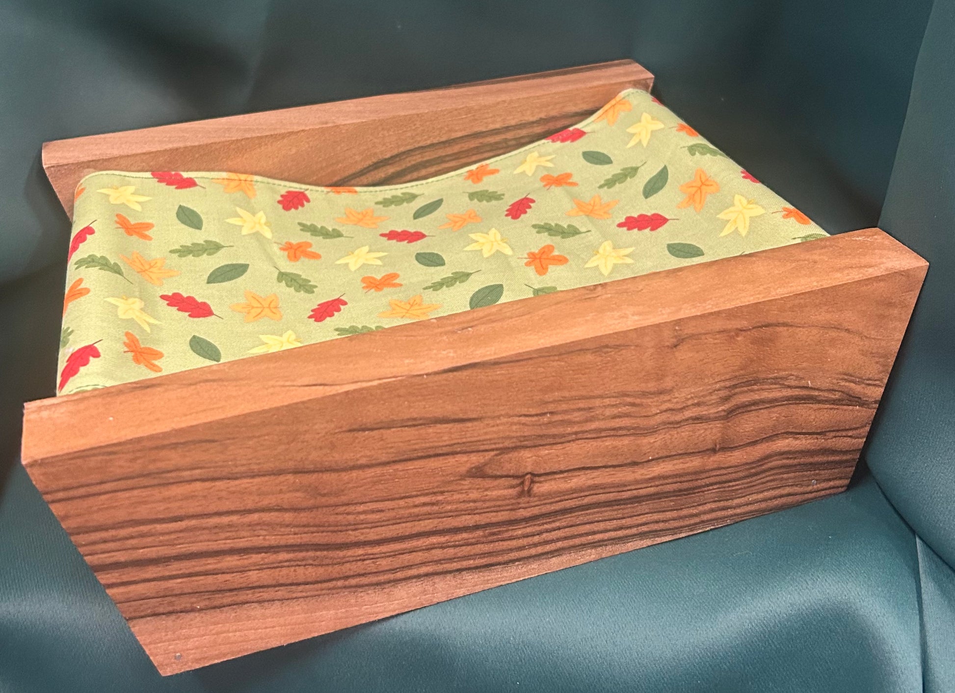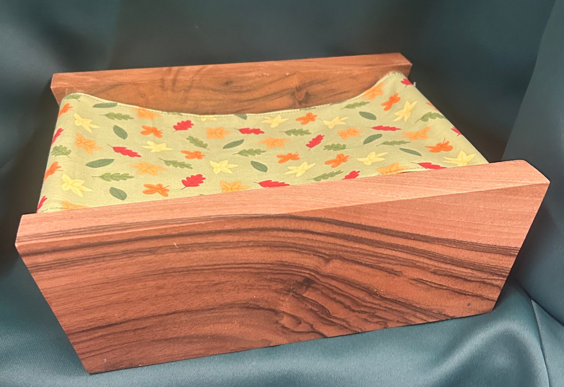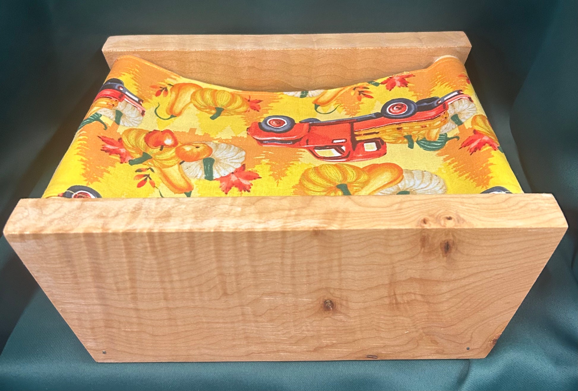 These baskets could hold fruit, keys, you name it! Pick your wood and your fabric for a customized product. Orchard walnut or curly maple wood. Seasonal or other fun fabrics!! Does not include shipping.